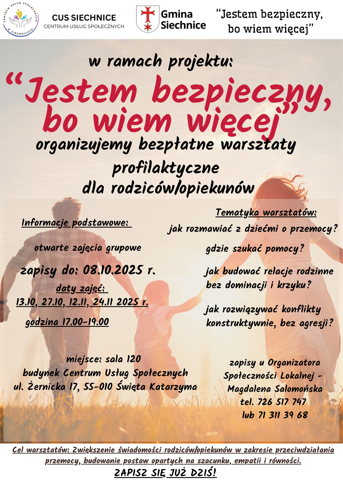 Z tej okazji Centrum Usług Społecznych w Siechnicach realizuje projekt „Jestem bezpieczny, bo wiem więcej”, w ramach którego organizuje bezpłatne warsztaty profilaktyczne zarówno dla dzieci i młodzieży, jak i dla rodziców oraz opiekunów.