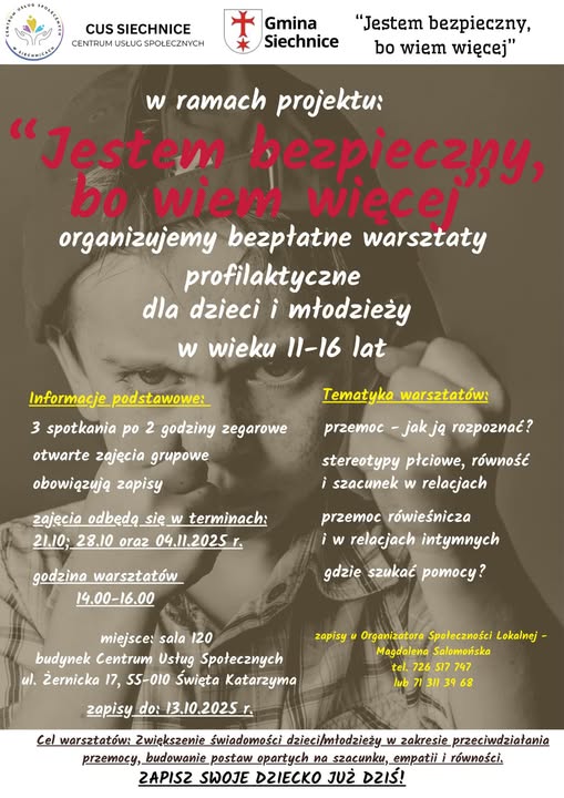 Z tej okazji Centrum Usług Społecznych w Siechnicach realizuje projekt „Jestem bezpieczny, bo wiem więcej”, w ramach którego organizuje bezpłatne warsztaty profilaktyczne zarówno dla dzieci i młodzieży, jak i dla rodziców oraz opiekunów.